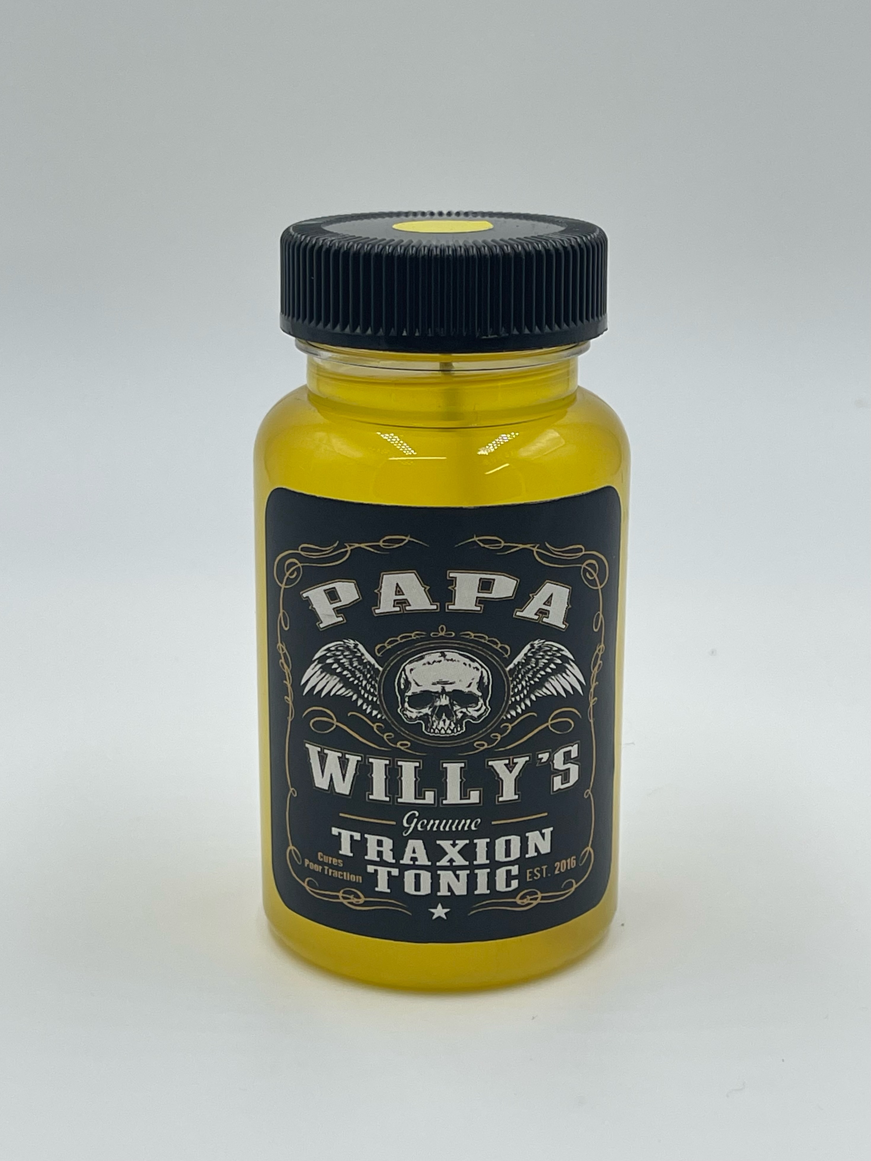 Papa Willy’s Traxion Tonic is a blend of chemicals that enhances the traction on RC car tires. Do not take it internally. Do not use in eyes. Avoid contact with skin. Not intended for children. Use precautions when using. By purchasing this product the user assumes all liability associated with miss-use of this product.